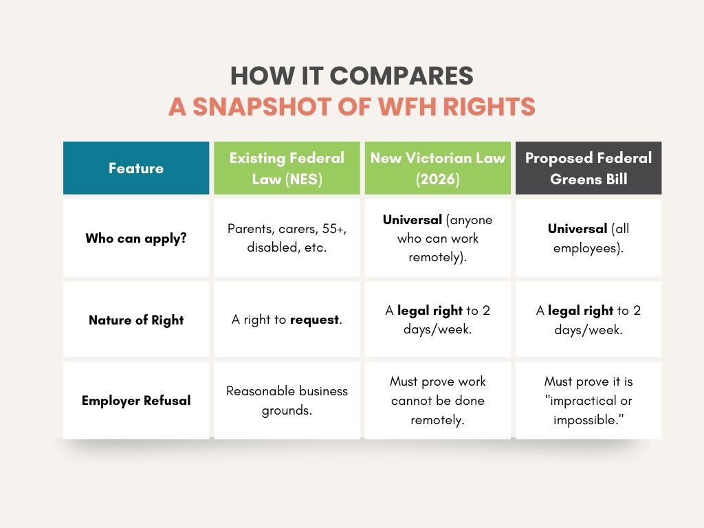 Unlike the federal Fair Work Act, which requires an employee to belong to a protected category (like being a parent or carer) to even make a request, Victoria’s new legislation creates a universal baseline.